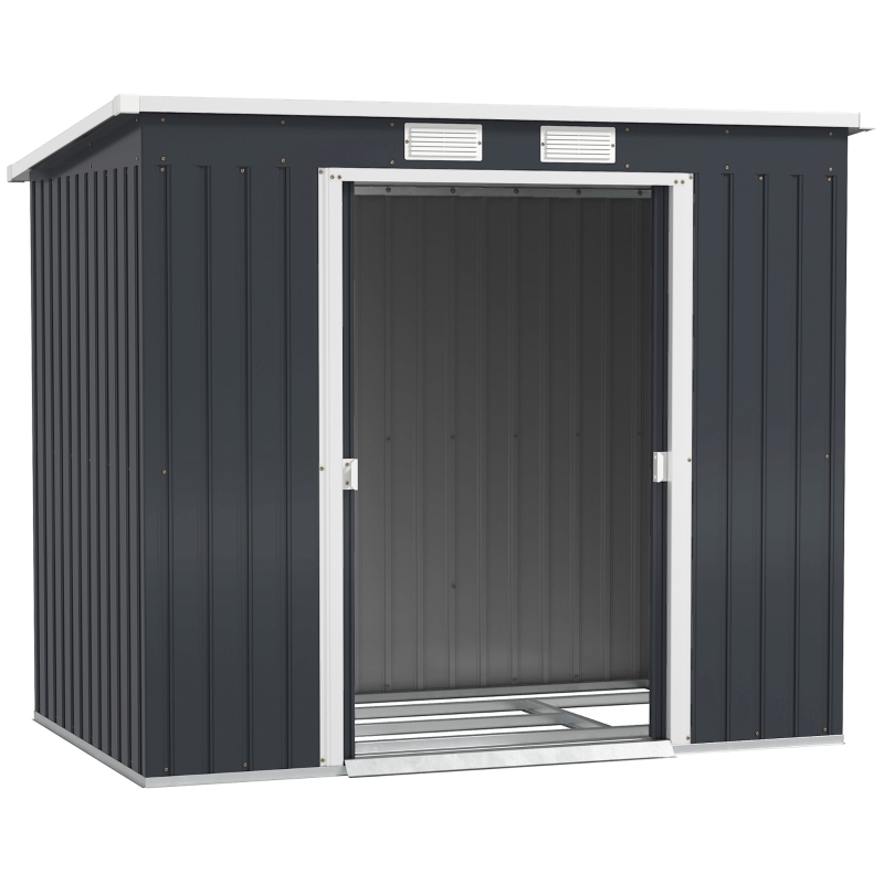 Large shed: Metal garden shed provides plenty of storage and holding room for your tools, outdoor equipment and garden furniture. || Steel structure: For extra toughness and semi-corrugated. Garden metal shed is suitable for outdoor use in all seasons. || Two air vents: Allows air in/out of metal storage shed easily. Keeps inside aerated and helps prevent mould and mildew build-up. || Double door shed: Easy to enter and leave this metal shed. Can be locked (lock not included) for security. || Dimensions: 173H x 213L x 130W cm. Foundation kit (not floor) included. Three people required for installation in approx. three hours – ALWAYS wear gloves. Do not build during windy weather conditions.