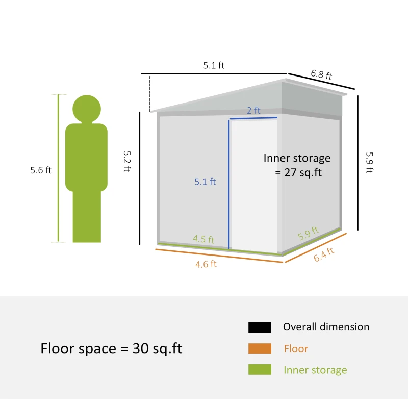 7 x 5ft outdoor storage shed: Store garden tools and equipment. Large enough for bikes or long-handled rakes and shovels. || Two hooks and two adjustable shelves: Easy organisation inside this lean-to shed, for holding and hanging smaller items. || Galvanised steel shell, with sliding door: Metal storage shed is outdoor ready. Strong and stable, it is resistant to water and UV damage. Door means shed is easy to enter and leave. || Two ventilation slots: Brings air inside metal garden shed, helps keep it fresh. || Dimensions: 160/181H x 154W x 206.5Dcm. Inner: 137W x 181Dcm. Gloves included to use during setup. 2-3 people recommended to build.