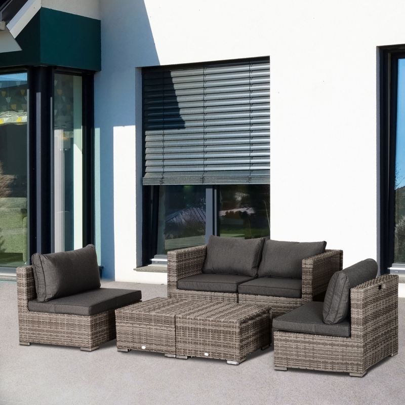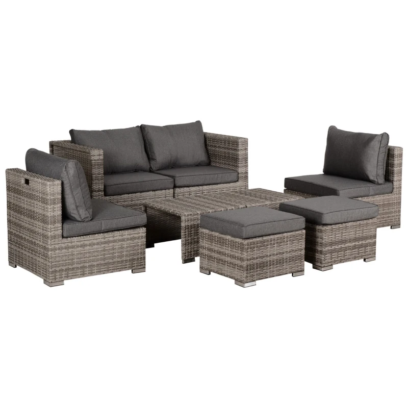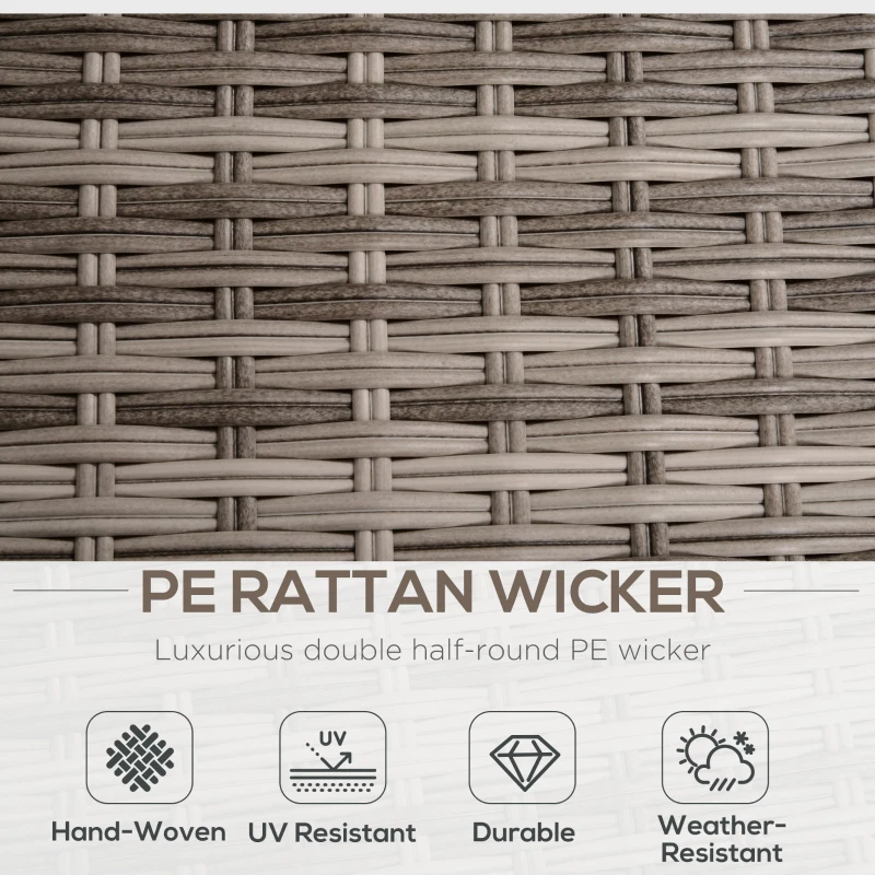 Eight-piece garden sofa set: Comes with two corner chairs, two armless chairs, two footstools and two square tables. Footstools of the rattan sofa set can also be used as extra seats. Seats up to six people. || Comfortable: All seats come with thick cushions, so you can relax into this rattan furniture set properly. Covers are removable and washable. || Space-saving: Footstools fit under the tables. Armless chairs fitting into the corner chairs. Saves space when not in use. || Steel, wrapped in rattan: Powder coated metal for a strong core. Plastic wicker creates a durable and protective shell, whilst adding garden style. || Dimensions: Corner chair: 71H x 75L x 75Wcm. Armless chair: 67H x 71L x 68Wcm. Footstool: 30H x 52L x 48Wcm. Table: 36H x 55L x 55Wcm. Maximum load: Single seat: 160kg. Table: 70kg. No assembly required.