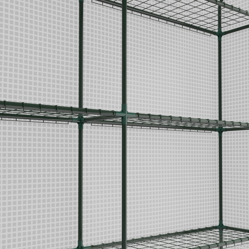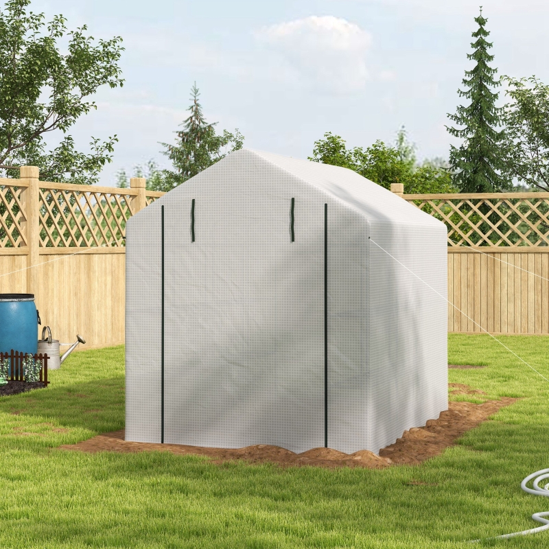 2.5 x 1.8 m (8 x 6ft) size, with 18 inner shelves: A spacious walk-in greenhouse to hold plenty of fruits and vegetables. Shelves on the side for holding and organising pots and more. || Plastic cover, with roll-up door: A protective shelter for plants inside this growhouse. Protects from wind, rain and UV, whilst still allowing nourishing sunlight to pass through. 10 cm edges to bury into the soil for extra stability. || Steel frame: Powder coated for extra strength, walk-in greenhouse with shelves has a tough core. Stands steady and upright. || Accessories included: Portable greenhouse comes with 4 x ground stakes and 4 x guy ropes to pin and secure to the ground. || Dimension: 210H x 244L x 180W cm. Maximum load 10 kg per shelf. Assembly required. Do not leave standing in heavy weather conditions.