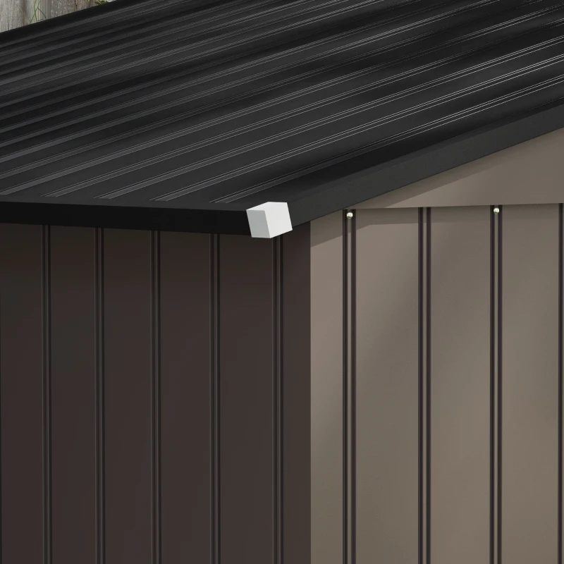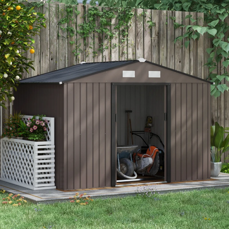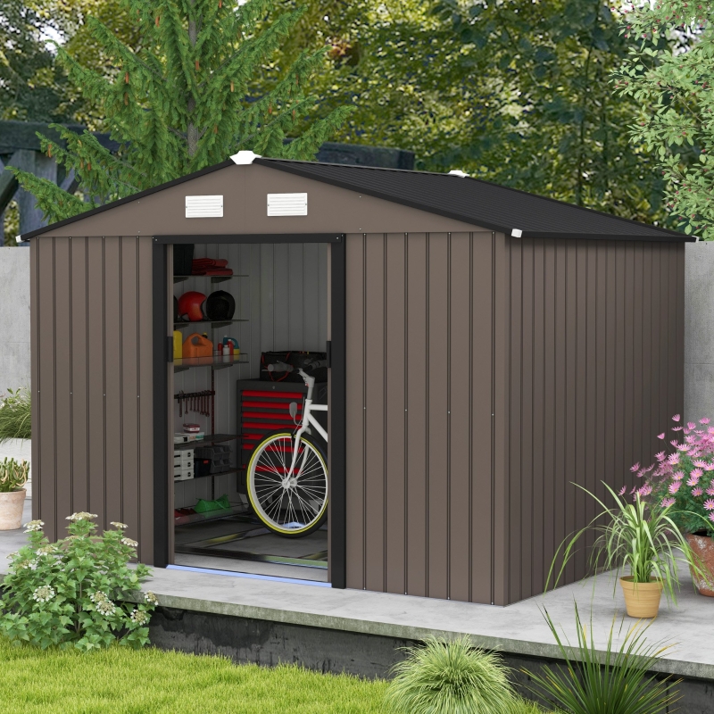 Best 9 x 6ft Metal Garden Shed, Outdoor Storage Tool House with Ventilation Slots, Foundation Kit and Lockable Double Doors, Brown