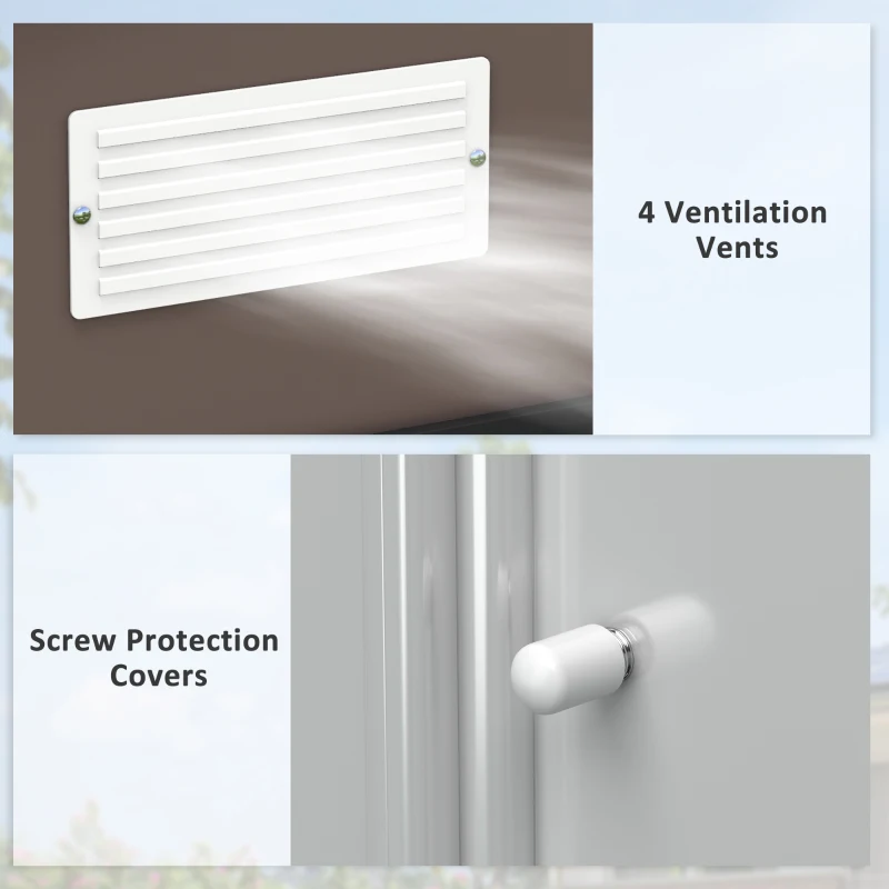 9ft x 6ft size: Outdoor storage shed provides plenty of room for gardening equipment, tools and outdoor supplies. || Steel structure: Finished with a top coat for weather protection, this metal garden shed is strong and tough for long-lasting use in your garden. || Sloping roof: Allows water to roll down to the ground, preventing buildup, stagnation and rust damage to this metal shed. Four ventilation slots to allow air inside – helps keep it fresh. || Lockable double door: Easy to access this outdoor shed. Lockable for safety when you are not around. (Lock is Not included.) || Dimensions: 192H x 277L x 195Wcm. Inner: 267L x 181Wcm. Door: 152H x 96Lcm. Three people required for installation in approx. four hours – ALWAYS wear gloves. Do not build during windy weather conditions. Foundation kit included.