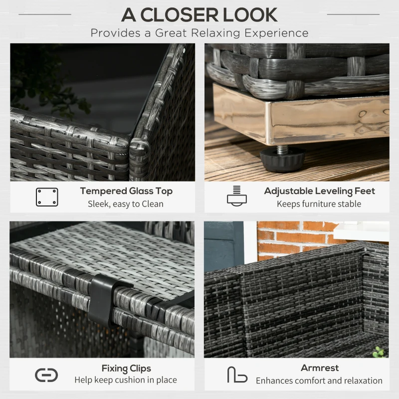 Stylish eight-piece rattan furniture set: Comes with two corner seats, four middle seats, a footstool and a coffee table. Set up in a shape how you want. || Steel, wrapped in rattan: Each piece of this garden sofa set has a strong and supportive frame, covered with plastic wicker for extra durability and a stylish look. Mild weather and UV resistant. || Thick cushions: Relax in complete comfort as you relax on this corner garden furniture set. Four bright coloured throw cushions included. || Square glass top coffee table: A handy place to keep things near. Matches the rest of this rattan garden furniture set. || Dimensions: Corner seat: 65H x 73W x 73Dcm. Middle seat: 65H x 60W x 73Dcm. Footstool: 32H x 60L x 60Wcm. Table: 39H x 66L x 66Wcm. Assembly required.