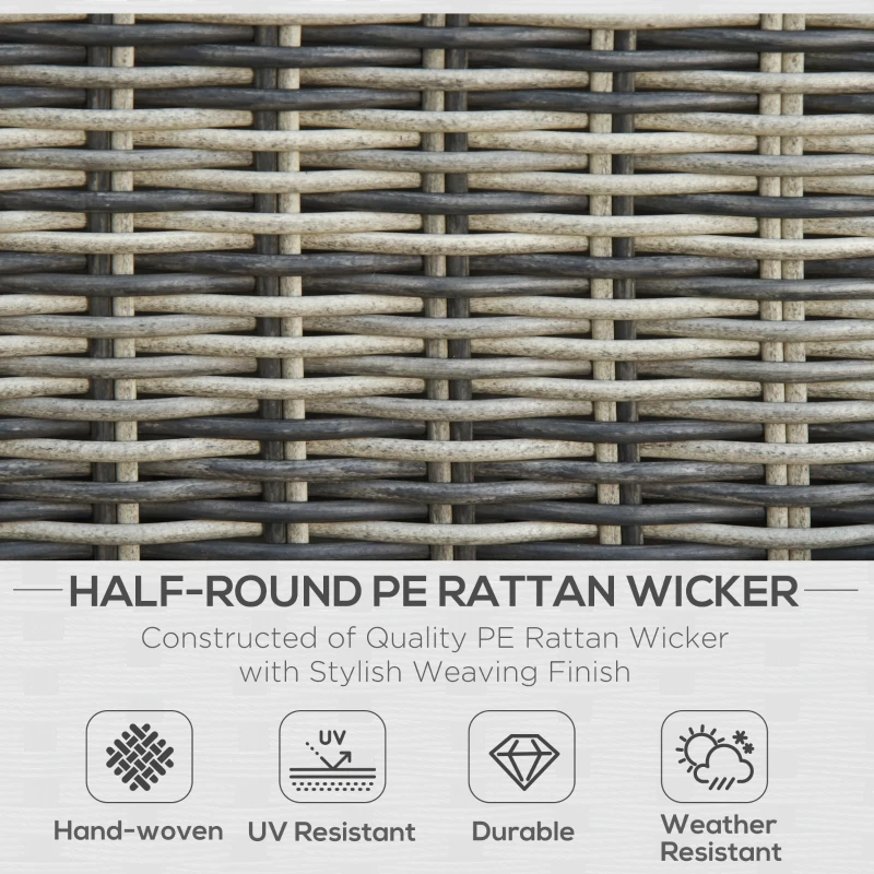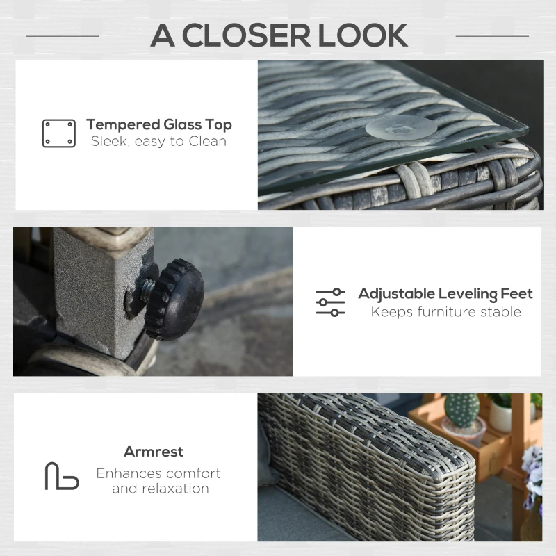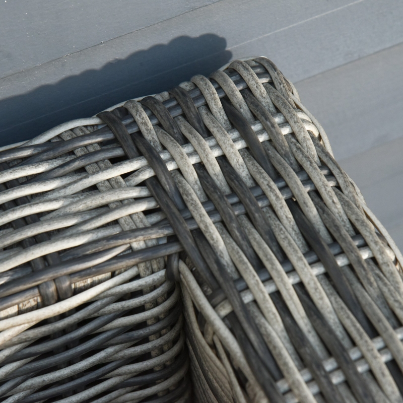 Five piece garden furniture set: Includes two corner armchairs, two footstools and a tall matching coffee table. Rattan garden furniture is a wonderful addition to gardens, balconies and other outdoor spaces in your home. || Thick and plush padded cushions: Sit comfortably on this five piece garden sofa set. Covers are removable and washable for hygiene. || Aluminium frame, wrapped in rattan: Garden rattan furniture set has a solid and tough core. Plastic wicker outer for protection against light weathering and UV fading. || Tempered glass tabletop: A sleek touch to this conservatory furniture set. Wipes clean easily for easy maintenance. || Dimensions: Chair: 65H x 73W x 73Dcm. Footstool: 31.5H x 63W x 63Dcm. Table: 49H x 73L x 49Wcm. Maximum load: Chair: 160kg. Table: 75kg.