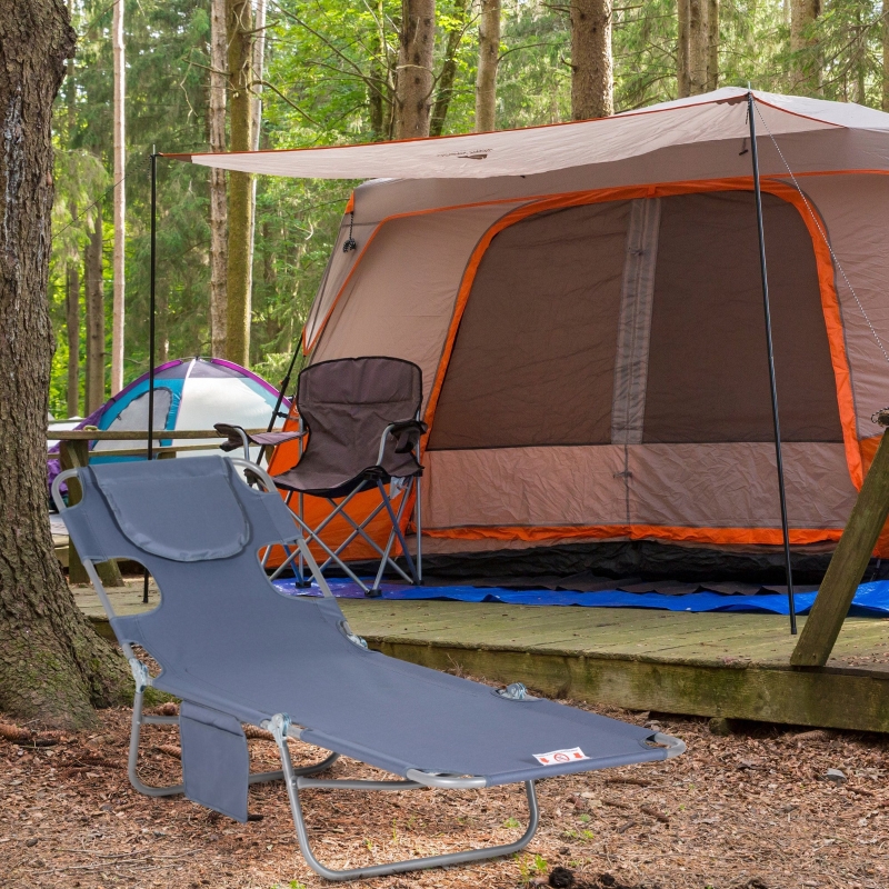 Padded face hold: Massage table style design for your head to rest in this garden lounger – perfect for sunbathing on your front. Great for reading too in your garden and outdoor area. || Five-level adjustable back: Folding sun lounger can be locked to different positions – easy to lie back at an angle you like. || Steel frame, foldable sun lounger design: Powder coated for extra strength – a supportive structure. Portable sun lounger is easy to carry and store. || Side pocket: Keep small things close by in this garden sun lounger. || Dimensions: Reclined: 88H x 185L x 55Wcm. Folded: 10H x 72L x 55Wcm. Maximum load 120kg. No Assembly required.