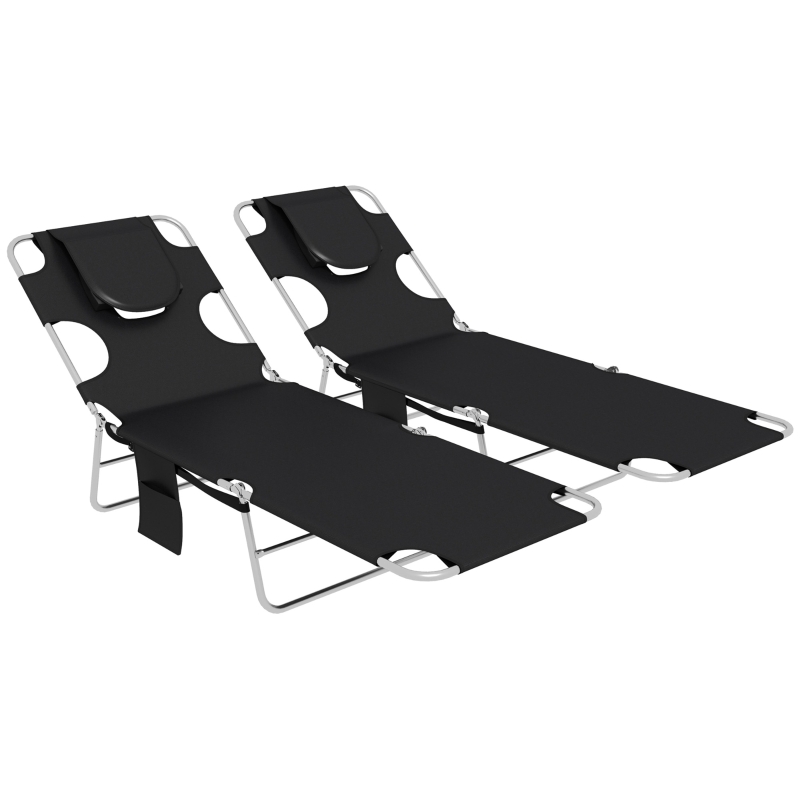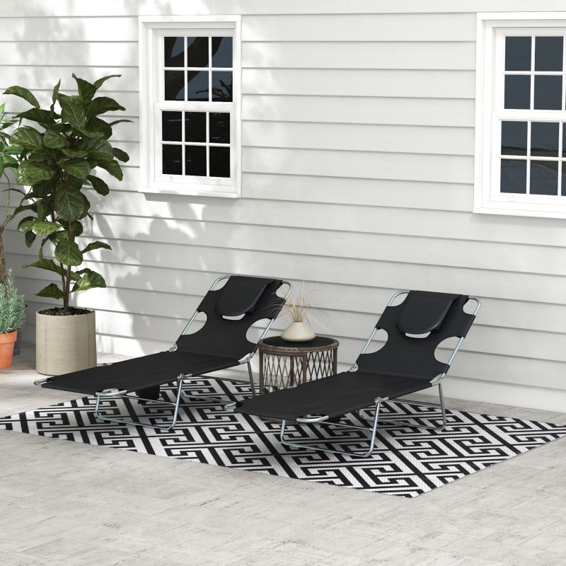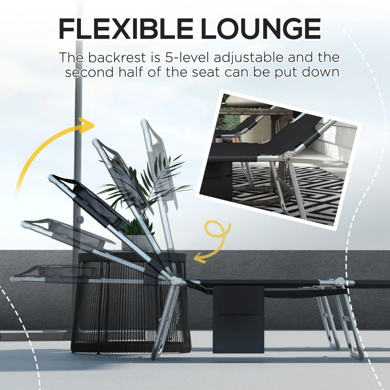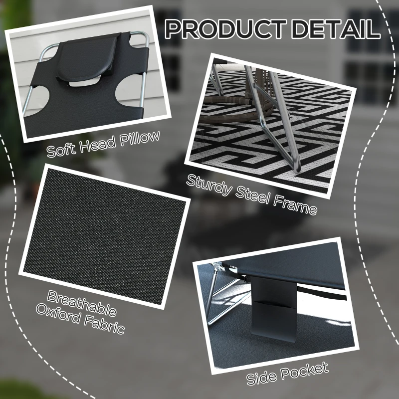 Padded face hold: Massage table style design for your head to rest in this garden lounger set – perfect for sunbathing on your front. Great for reading too in your garden and outdoor area. || Five-level adjustable back: Folding sun loungers can be be locked to different positions – easy to lie back at an angle you like. || Steel frame, foldable sun lounger design: Powder coated for extra strength – a supportive structure. Portable sun loungers are easy to carry and store. || Side pocket: Keep small things close by in this garden sun loungers. || Dimensions: Reclined: 29H x 185L x 55Wcm. Folded: 10H x 72L x 55Wcm. Maximum load 120kg. No Assembly required.