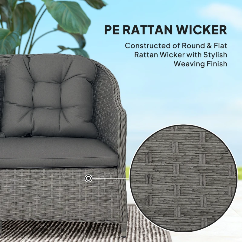 Four-piece set: Comes with two chairs, loveseat and matching table. Small garden furniture seats up to four people – great for relaxing in your garden and outdoor spaces. || Tempered glass top table: A stylish touch, which also acts as a safe and solid centrepiece. Easy to wipe clean. || Comfortable: Soft padded cushions on the seats and backs of each chair. || Aluminium wrapped in rattan: Core metal frame for strong support, with plastic wicker for a durable and stylish garden look. || Dimensions: Loveseat: 84H x 129W x 79Dcm. Chair: 84H x 64W x 79Dcm. Table: 62H x 100L x 60Wcm. Maximum load: Loveseat: 240kg. Chair: 120kg. Table: 50kg. Assembly required.