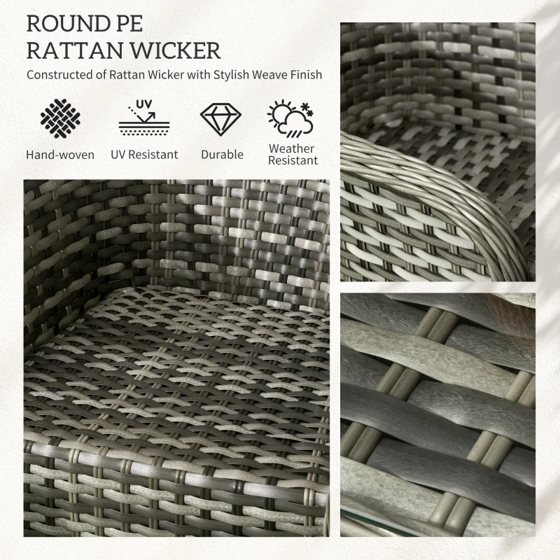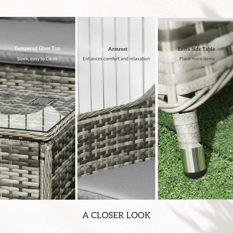 Four-piece set: Two chairs, double sofa and table – this garden sofa set is great for bringing everyone together outdoors. || Seat cushions: Each chair and sofa in this conservatory furniture set have soft padded cushions – great for relaxing. || Aluminium frames, wrapped in rattan: Strong core for each piece in this garden furniture sets. Unique all-hand woven PE rattan wicker wrapped on for an extra durable and stylish. || Glass top table: A sleek and safe finish to this outdoor furniture set. Keep items close to you. || Dimensions: Chair: 83H x 63W x 78Dcm. Sofa: 83H x 129W x 78Dcm. Table: 42H x 96L x 46Dcm. Assembly required.
