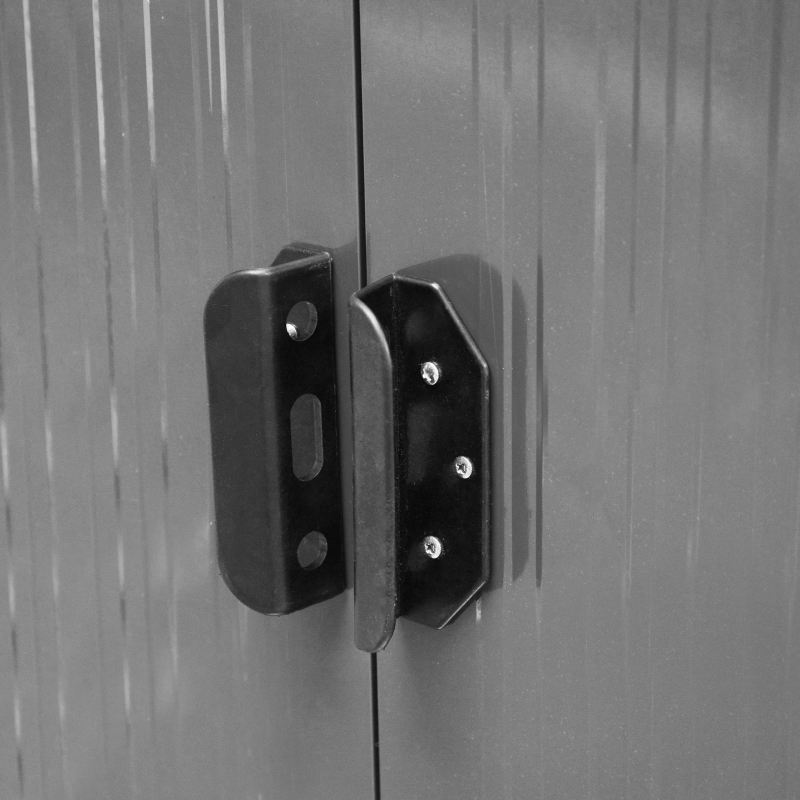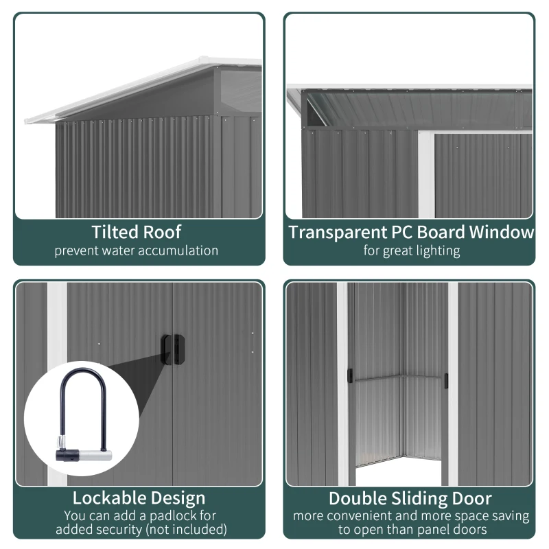 6.4 x 8.5ft size: Garden tool shed for keeping outdoor equipment, outerwear, furniture and other accessories. Freestanding design so you can set up wherever you want. || Lightsky panel: Clear front pieces allows natural light to radiate inside, making the metal garden shed easy to see inside during the day – no lights required. || Corrugated steel structure: This is a strong metal storage shed which stands steady. A safe house for your garden items. || Double door shed design: Easy to enter this metal bike shed, also easy to fit larger items too. Lockable for safety. || Dimensions: 179/200H x 194W x 260Lcm. Door: 173H x 94Wcm. Three people required for installation in approx. four hours – ALWAYS wear gloves. Do not build during windy weather conditions.