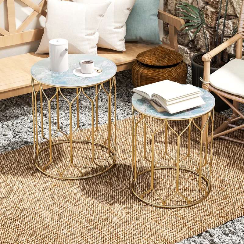 Two-piece set: The outdoor side tables feature a marble-textured ceramic tile top with a unique hollow-carved pattern, adding sophisticated charm. || Nesting Design: Small garden table can be stacked under the large, space-saving when not in use, easy to move and transport. || Metal frames: Powder coated for extra protection – a strong, supportive core for the small outdoor table set, holding up to 30 kg. || Versatile use: A outdoor side table set, small garden coffee table set, patio plant stand set and beyond, suitable for indoor and outdoor use. || Dimensions: Large: 50H x Φ42.5 cm. Small: 45.5H x Φ38.5 cm. Maximum load: 30 kg. No assembly required.
