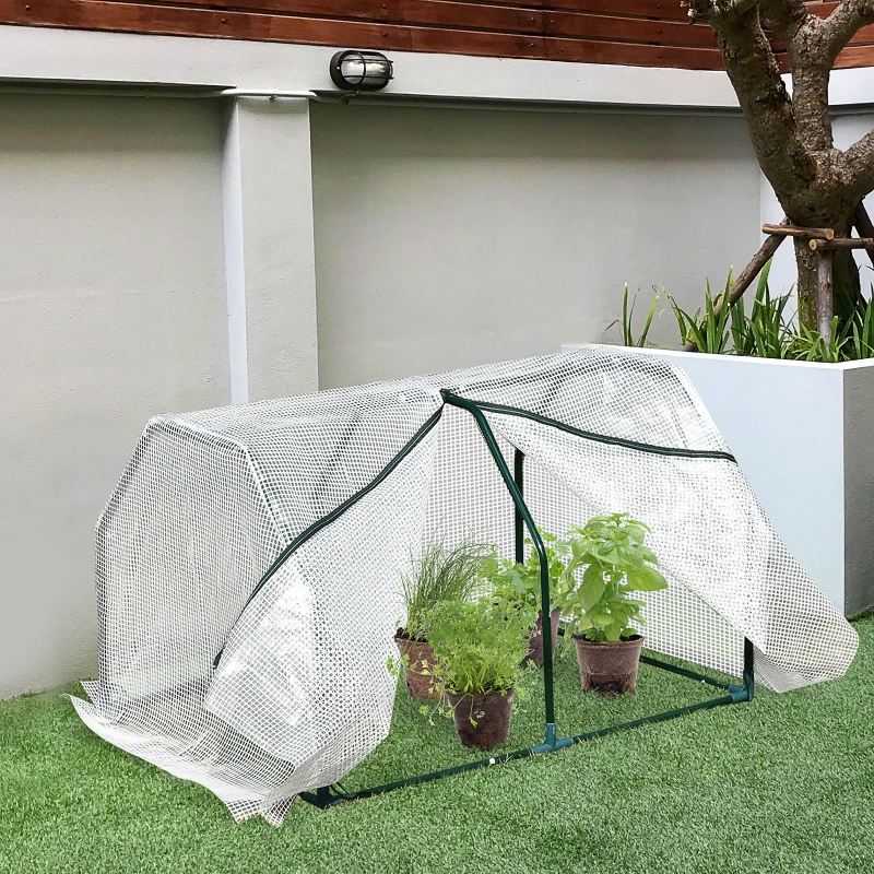 WIDE AND LOW DESIGN: Portable design is perfect for placing in small spots, allows you to garden virtually almost anywhere. A great addition to balconies and patios. || STEEL FRAME: Powder coated for extra strength, it features five cross bars and plastic connectors to ensure long-lasting use all year round. || PLASTIC MESH COVER: Protects your plants, vegetables and more from the mild wind and light rain, whilst allowing sunlight and air to pass through to promote steady and healthy growth. || MIDDLE ZIP FASTENING: Provides easy access in and out and can be held up at the sides. || DIMENSIONS: 60H x 99L x 71Wcm. ASSEMBLY REQUIRED. NOTE: Not suitable for bad weather conditions.