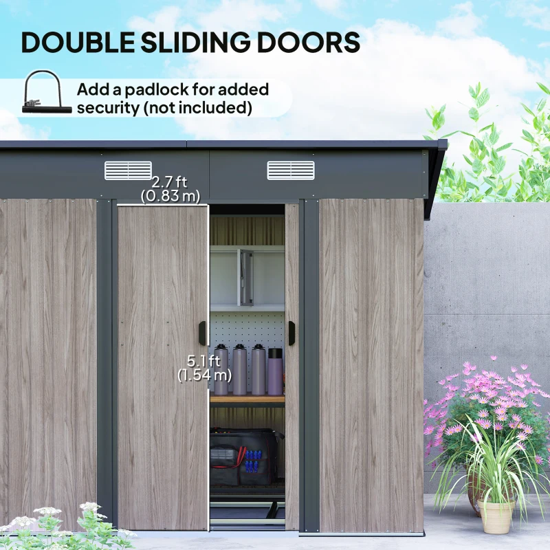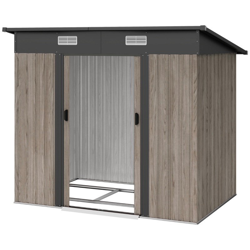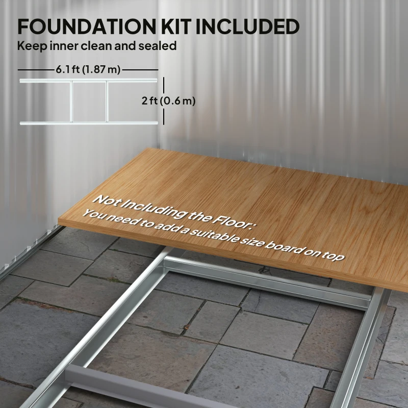 6.8ft x 4.3ft size: Room for keeping garden and outdoor tools, outerwear, furniture and other equipment. Freestanding design so you can set up this garden shed where required in your home space. || Air vents: Two top front slots to keep metal shed inner as fresh as possible, helping to reduce mould and mildew build-up. Sloped roof to prevent rainwater build-up. || Corrugated metal structure: Strong formation, shed stands steady and safely houses the inner items. Sloped roof to prevent rainwater build-up. || Sliding door: Easy to enter and leave this garden tool storage shed. || Dimensions: 207L x 130W x 182Hcm. Foundation kit INCLUDED. ASSEMBLY REQUIRED. Three people required for installation in approx. three hours – ALWAYS wear gloves. Do not build during windy weather conditions.