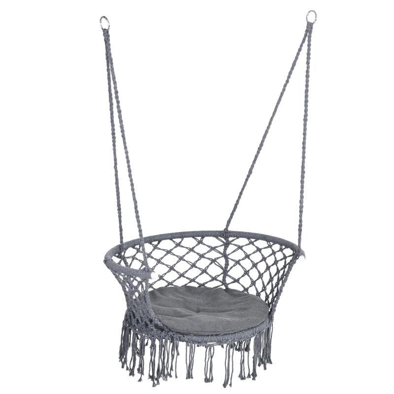 STYLISH HANGING CHAIR: Boho style, with macrame net pattern and fringe tassels – elegant and pretty. A decorative piece for your special garden and outdoor spots. || COMFORTABLE: Dense wrapped cotton seat holds your body in place – easy to sit over long periods (reading, catching the sun, socialising with friends). || METAL FRAME: Strong structure fully supports you when seated. Four long hanging ropes keep the hanging hammock chair balanced. || DIMENSIONS: 80W x 60D x 36Hcm. Seat: Φ60cm. || MAXIMUM LOAD 120KG. ASSEMBLY REQUIRED.