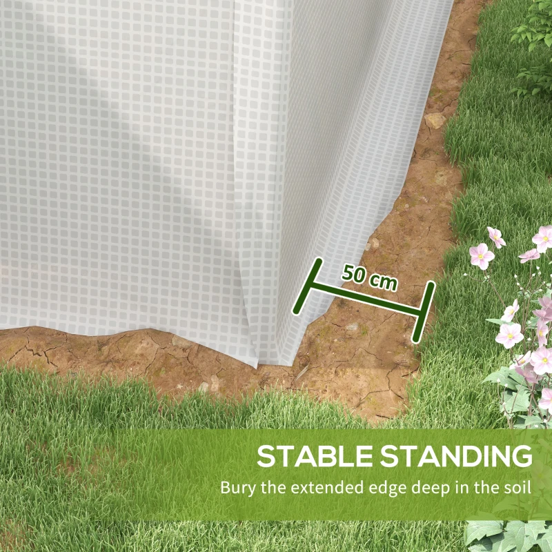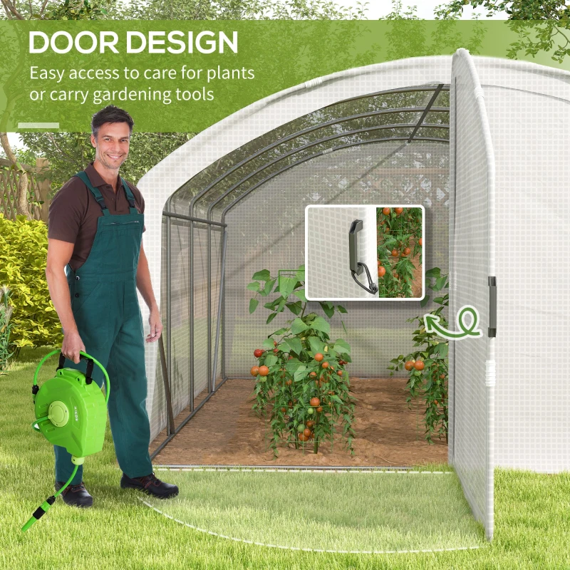 400 x 300cm tunnel design: Polytunnel is large and spacious. Open design offers plenty of growing room for plants and more. || Hinged door: Easy access inside garden polytunnel, and is easy to fix with a built-in ball. Big opening design allows for cross ventilation, so temperature and humidity are in your hands. || 220gsm plastic cover: Middle reinforcement for extra durability, also tear resistant. Garden polytunnel is a safe shield for plants, protects against weather. || 50cm extended edges: Bury into the ground, helps keep polytunnel greenhouse standing steady. || Dimensions: 400L x 300W x 195Hcm. Door dimensions: 150W x 190Hcm. Convenient to assemble with screws and film clamps. Recommended that 2-3 people assemble it.