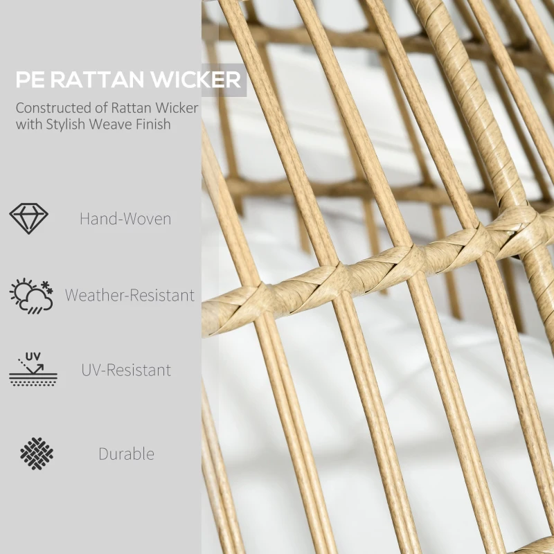 Spacious outdoor egg chair: A place to sit and hide away into – intended as an individual garden chair. || Inner cushion seat: Fitted with padded seat, back and arms, this rattan chair is comfortable – easy to rest and relax over longer periods. || Steel frame, wrapped in rattan: The caged design is bold and beautiful. Wicker chair has a strong core, with plastic rattan over the top for extra durability and a stylish finish. || Four-legged base, with adjustable feet: Easy to change the height, keeps the egg garden chair balanced and steady when the ground is slightly uneven. || Dimensions: 148H x 105W x 90D cm. Maximum load 120 kg. Assembly required.