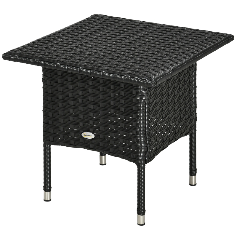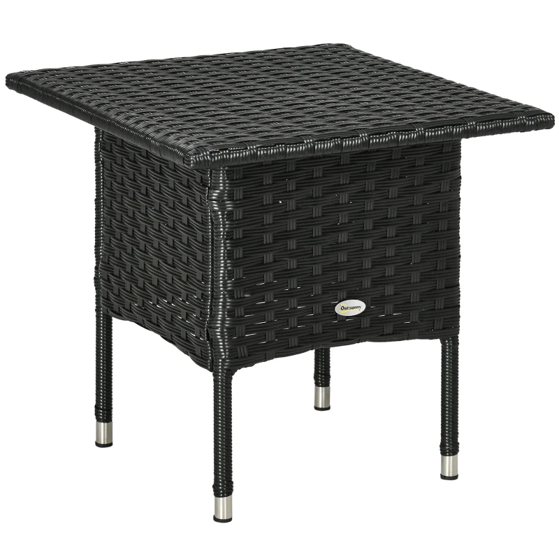 Rattan side table: A great addition to your garden furniture this season and beyond. Neutral colour is easy to blend with other pieces. || Steel frame, wrapped in rattan: Galvanised for an extra strong core, this outdoor coffee table is wrapped in plastic wicker for double the durability. || Four legs: Garden coffee table stands stable, with foot pads for gentle protection. || Large table top: Rattan coffee table has plenty of room for holding what you need close to you. || Dimensions: 47H x 50L x 50W cm. Maximum load 30 kg. Assembly required.