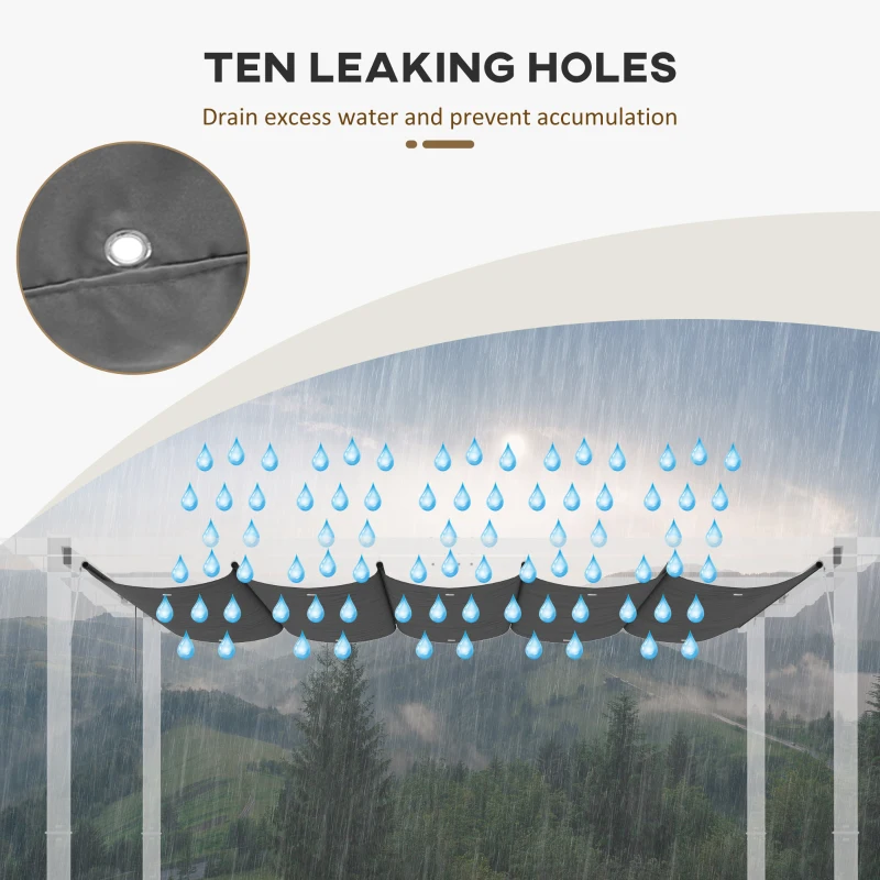 Canopy specification: The replacement canopy can ONLY FIT Best 3 x 3 (m) pergola (SKU: 84C-054BK). Please verify the size and model of your gazebo before purchasing. || Polyester fabric: Quality material, this canopy cover replacement will shield you underneath from direct sun and provide shade. || Excellent drainage: Ten holes in the pergola shade to drain excess water and prevent accumulation will not cause too much weight on the top. || Easy to attach: Fit the end holes onto the rods and hooks. Note: Only the replacement fabric is included. || Dimensions: 250L x 255Wcm.