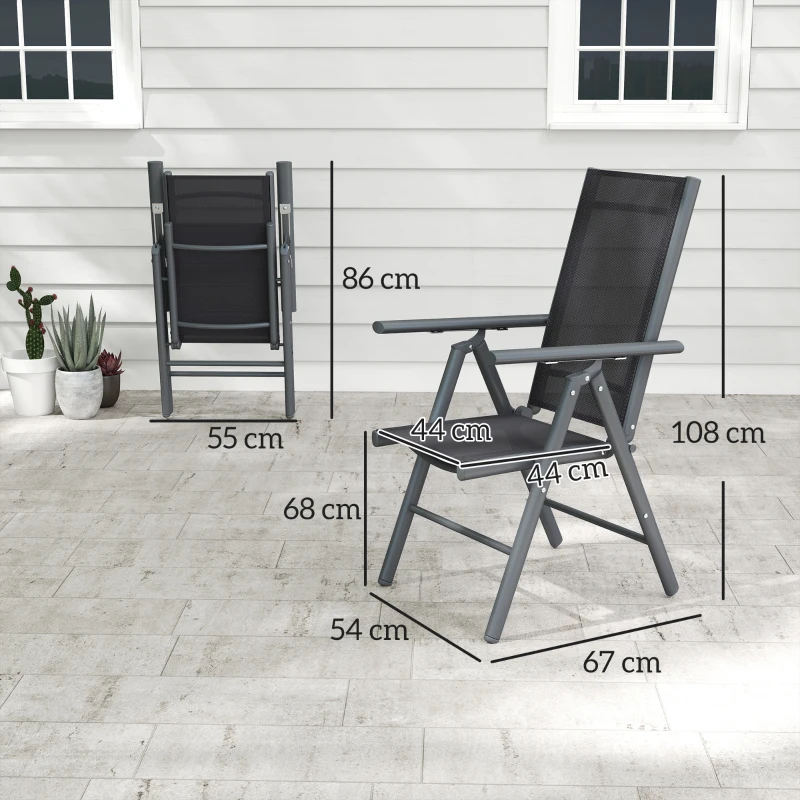 Set of two: Sit outdoors with company with these folding chairs – enjoy the garden and outdoors with company. Or use them separately where you want. || Mesh fabric seats: Soft and breathable to keep comfortable and cool on these camping chairs. High backs and arms for support. || Aluminium frames: Powder coated for extra strength outdoor chairs support you properly. Resistant to rust and corrosion – suitable for outdoor use. || Folding: Easy to carry and store, take these camping chairs around with you to plenty of places. || Dimensions: 108H x 54W x 67D cm. Folded: 19H x 86L x 55W cm. Maximum load 120 kg. No assembly required.