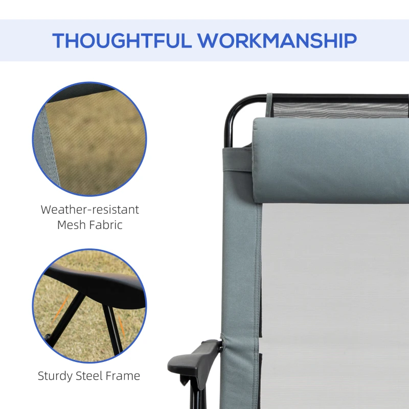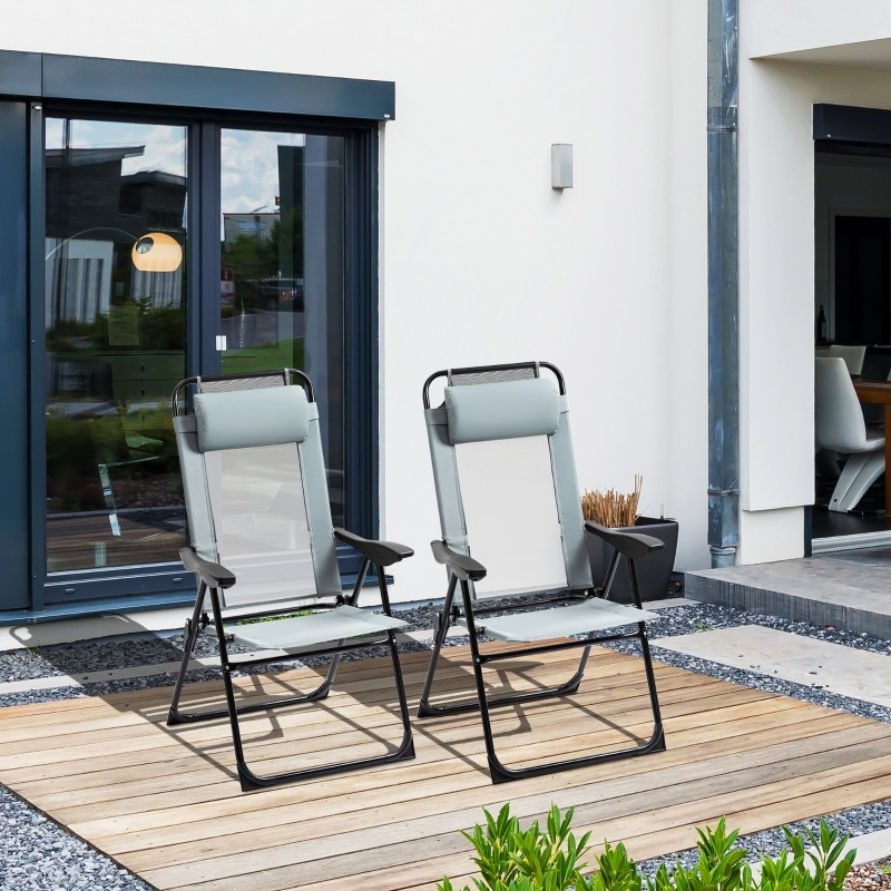 TWO-CHAIR SET: A place for you and a friend to lounge and relax. The easy way to enjoy your garden and outdoor areas, anytime. || ADJUSTABLE BACK: Sets to five different levels – lie back in a position you like. Take some time out, read a book or have a drink – plenty of position to do a multitude of activities. || STEEL FRAME: Strong core structure, keeps you fully supported as you sit. Base shape promotes balance. Fabric seat holds you comfortably, with a padded pillow for extra support. || FOLDABLE: Easy to move and store. DIMENSIONS: 109H x 62W x 70Dcm. Folded: 10H x 99L x 62Wcm. || MAXIMUM LOAD 120KG. NO ASSEMBLY REQUIRED – UNPACK AND USE!