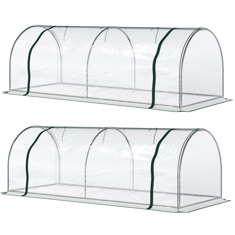 Set of two: The set includes two 250 x 100 cm garden greenhouses. Walk-in design, a shelter for keeping plants together. Helps manage and grow vegetables, fruits, flowers and more all year round. || Large zipped door: Opens and rolls up, easy to enter and leave. Also allows air in to ventilate. || Plastic cover: Lightweight plastic maintains high humidity levels, suitable levels for growing plants to grow. Clear finish, allows nourishing sunlight to pass through. || Steel frame: Constructed with strong powder-coated steel frame, rust-resistant for long-lasting use.10cm overlong edges to bury in soil. || Dimensions: 250L x 100W x 80Hcm. Assembly required.