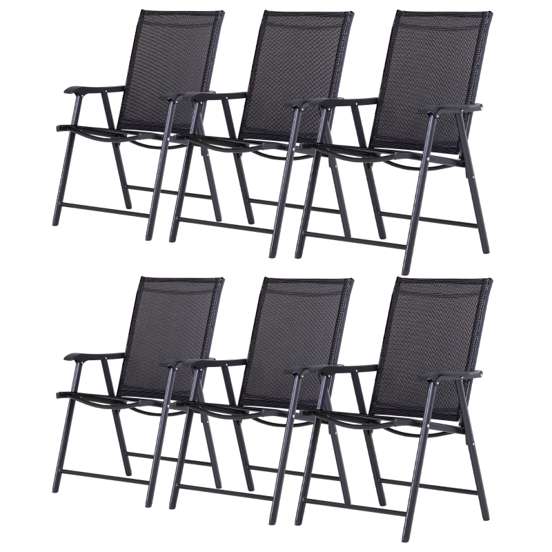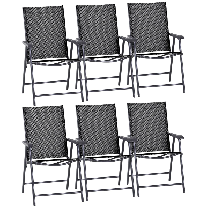 Set of six: The six seats for taking with you on camping trips, outdoor dining, picnics or even keeping at home for when guests come over. || Folding design: Lightweight and completely portable, these garden dining chairs are excellent for packing up in your car or storing away when not needed in your home. || Metal frame: Powder coated frame for extra strength, each garden chairs are firm and strong. Combines a high back, wide seat and mid-rise arms for comfort and support. || Textline seat: Allows your skin to breathe whilst seated €“ great for the hotter days. || Dimensions: 94H x 58L x 64Wcm. Seat: 45W x 47Dcm. Folded: 17H x 86L x 58Wcm. Maximum weight: 100kg per seat. No assmebly required.