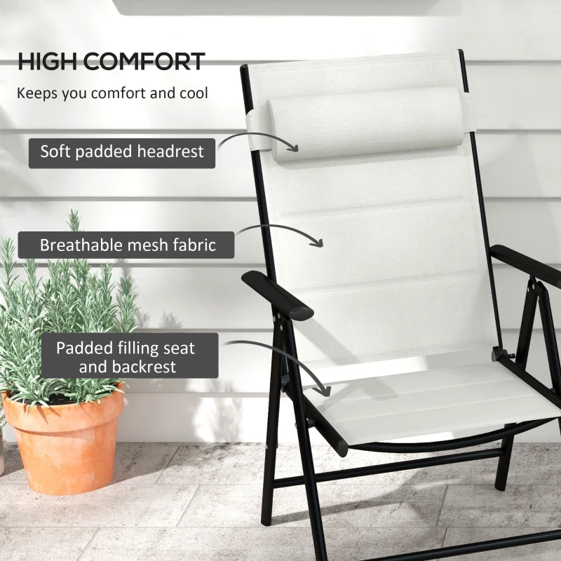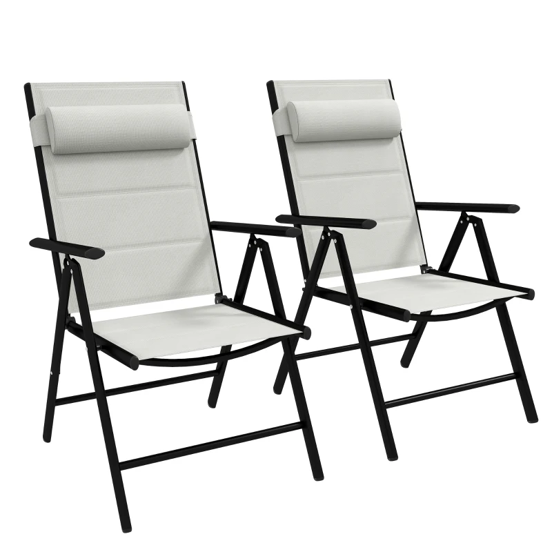 Two-piece folding chairs: A set for you to relax outdoors, with company. || Foldable: Padded folding chairs are easy to carry and store, suitable for taking with you on trips. || Padded: Comfort with garden chairs. High back, armrests keep you supported. || Powder-coated aluminium frames: A strong structure. Covered with breathable mesh fabric. || Dimension: 108H x 54W x 67Dcm. Folded: 19H x 86L x 55Wcm. Maximum load 130kg. No assembly required.