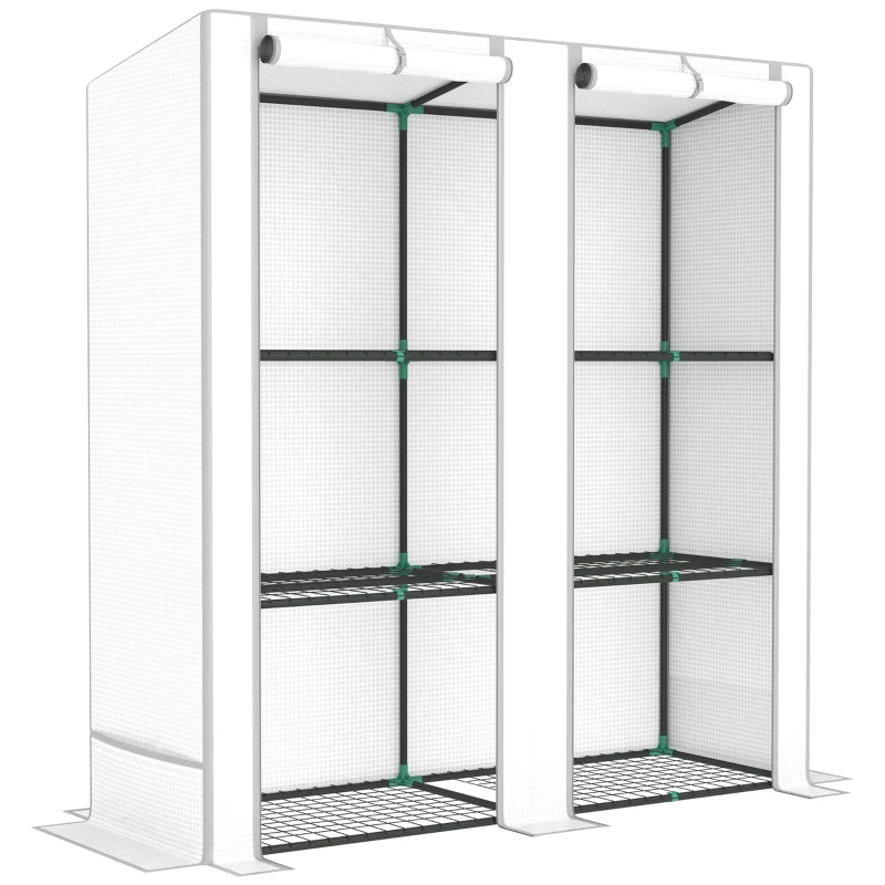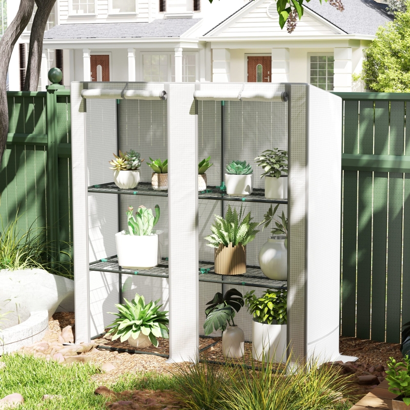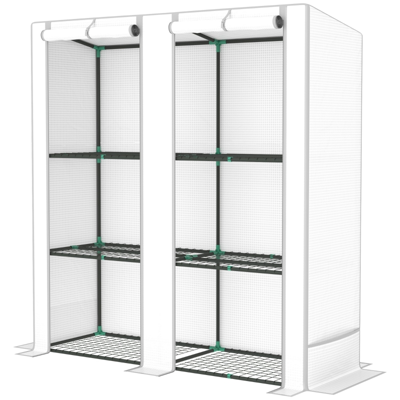 Three-tier: Plastic greenhouse features offers space to hold and organise plants, flower pots, seed trays and more. || 140 gsm plastic cover: A protective shell for this lean-to greenhouse. UV resistant, protects against mild weather, whilst allowing in 85% sunlight for maximum growth. Hemmed edging for extra strength. || Two roll-up zipped doors: Easy access and ventilation whenever you need inside this indoor greenhouse. Top-fixing straps to hold in place. || Powder coated steel frame: A strong core for this portable greenhouse. Bury the extended edges for a secure fitand use side bags filled with heavy objects such as stones or sand to prevent wind tipping. || Dimensions: 142/152H x 144W x 48D cm. Maximum load 8 kg. Easy to assemble: 1-2 people required.