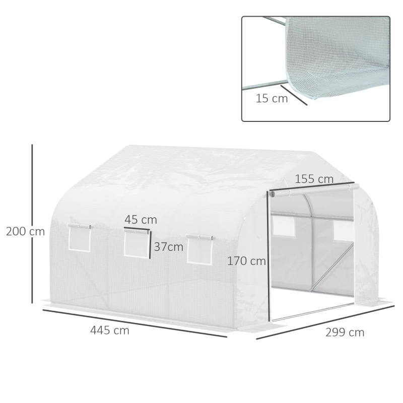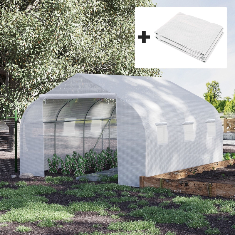 WALK-IN GREENHOUSE: An ideal way to extend your growing season by protecting plants from cold and birds while easily managing your plants. Suitable for growing tropical plants, vegetables, fruits, flowers, etc. || 2 PE PLASTIC COVERS: Comes with two covers for easy replacement. Fully closed UV protection PE cover maintains high humidity levels for growing plants and allows nourishing sunlight to pass through. The 15cm extended edges should be deeply buried in the soil to tighten the cover for more stability and against rainwater accumulation. || ROLL-UP DOOR & WINDOWS: The tunnel greenhouse’s zippered roll-up door can be opened fully for easy access this greenhouse outdoor and transport of plants or tools. The 6 mesh windows provide better air circulation for plants in this large polytunnel and are resistant to bugs. They can also work as observation windows to observe the growth of plants. || STEEL FRAME: Made of galvanized steel frame for strength. For more stability, the greenhouse has 2 extra slant supporting rods, 4 included wind ropes should be tightened and fixed on the ground by 4 ground nails. || PRODUCT DETAILS: Greenhouse Dimension: 445L x 299W x 200Hcm, Replacement Cover Size: 447L x 300W x 200Hcm. NOTE1: Please do not use acidic pesticides to avoid chemical reactions with the alkaline PE cover, which result in breakage.