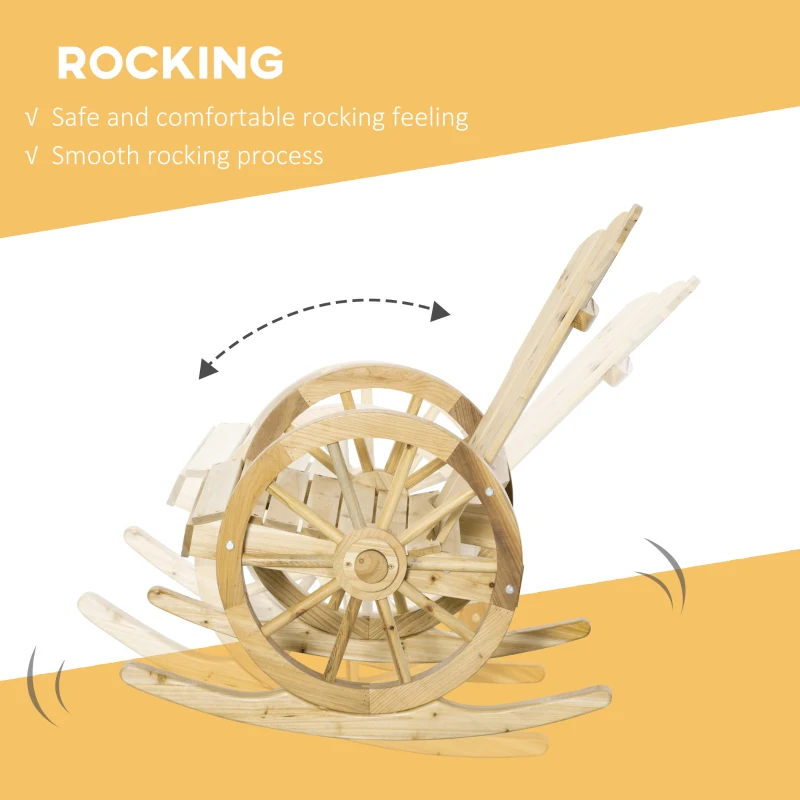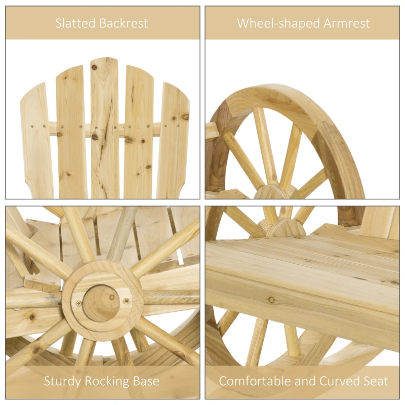 Adirondack chair: A traditional style piece which will be sure to add interest and intrigue into your garden. || Fir wood body: Strong and robust for reliable use outdoors. Natural wood finish gives the garden rocking chairs a touch of rustic charm which only gets better with age. Slatted all over to prevent water build up. || Rocking base: Smoothly curved, this outdoor rocking chair can sway back and forth gently – a great way to relax outdoors and in your garden. || Comfortable: A wide seat paired with a high back and slightly curved seat make this rocking chair outdoor great for sitting on for long periods of time. || Dimensions: 68W x 88D x 92H cm. Seat: 53W x 48D cm. Maximum load 113 kg. Assembly required.