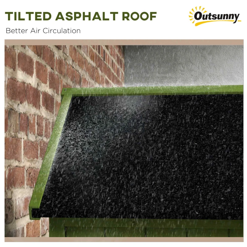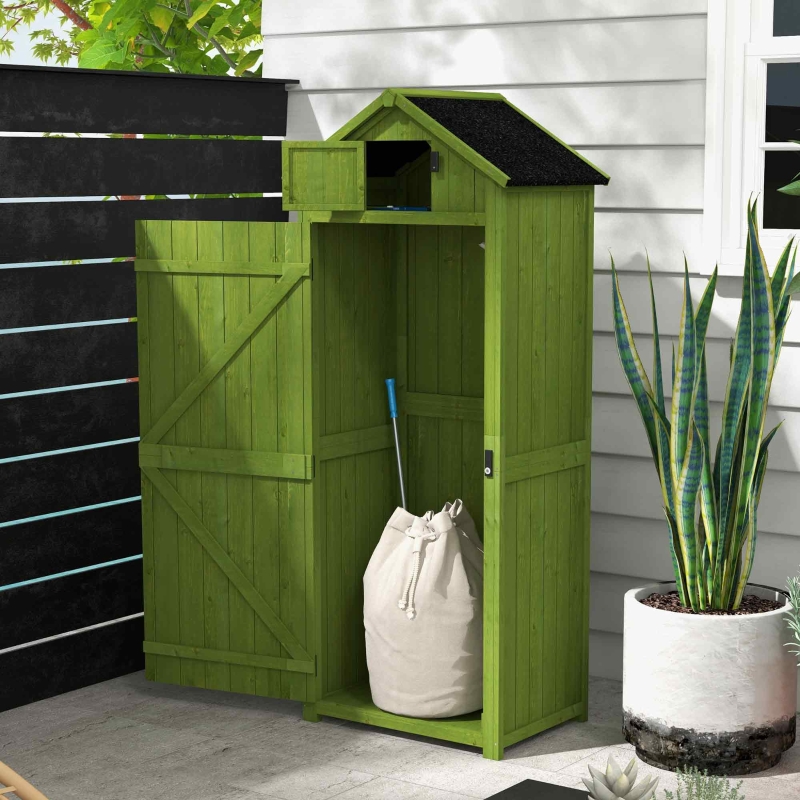 Durable and weather-resistant: Made from solid fir wood with water-resistant paint, this storage cabinet is designed to withstand outdoor elements, ensuring long-lasting use. || Efficient tool organization: Features 3 detachable shelves for small items and a larger area for longer tools, making it ideal for organizing gardening tools and outdoor equipment. || Secure and accessible: Equipped with a lockable door for security and a top window for ventilation, this shed ensures your tools are safe and easily accessible. || Perfect for gardening enthusiasts: Offers a compact and practical solution for storing garden tools, keeping your outdoor space tidy and organized. || Enhanced protection: The tilted asphalt roof prevents water accumulation, while the protective paint coat adds extra durability, making it a reliable garden storage solution.