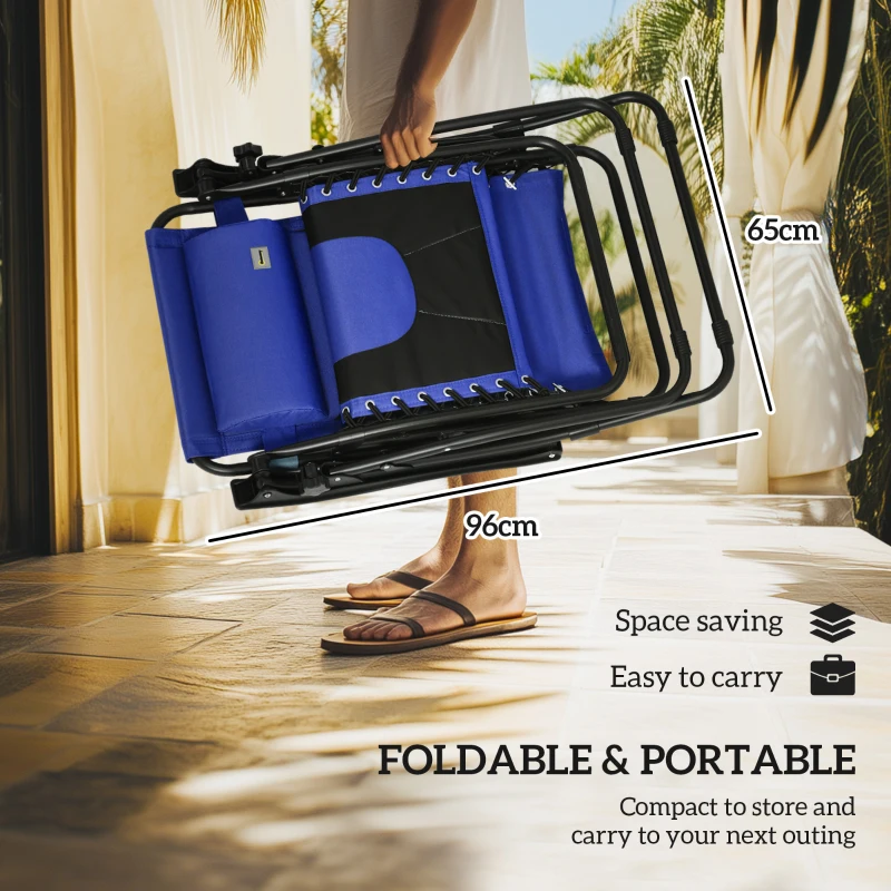 Zero gravity chair: Cool design outdoor chair for a stress-free weightless, keeping you relaxed. Great for your patio, garden, balcony or any other indoor/outdoor areas. || Adjustable reclining position: Relax with the smooth recline function. Padded seating with removable padded headrest for added comfort in lounging time || Solid: Steel frame is strong, anti-peeling and corrosion resistant. Fabric seat to sit with support. Foldable – easy to carry and store. || Cup holder and canopy: Shade keeps you cool as you recline. Tray with cup holder allows easy access to drinks, magazines, phones, tablets and other small items. || Dimensions: 89D x 65W x 113H cm. Folded: 96L x 65W x 14H cm. Max Load: 120 kg.