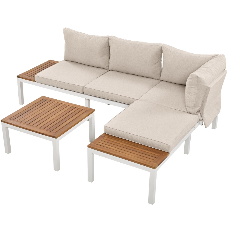 / Elegant Outdoor Garden Lounge Set with Wooden Table, Thick Cushions, L-Shaped Corner Sofa for 4 People, 145L x 60W x 80H cm, Beige